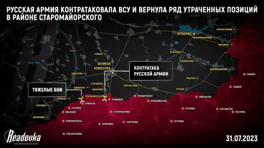 На Времевском выступе Вооруженные силы Украины (ВСУ) пытаются развить успех и продвинуться в строну Урожайного. Русская армия в ходе тяжелых боев уничтожила подразделения украинских сил специальный операций (ССО), которые Киев применил в качестве штурмовой пехоты. Наши бойцы контратаковали в районе Старомайорского и вернули ряд утраченных позиций. Под Работино и Приютным продолжается методичное уничтожение бронетехники и живой силы боевиков.