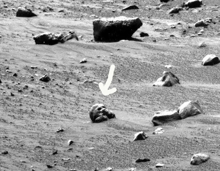 На фотографиях, которые ранее передавал марсоход «Спирит» — предшественник «Любопытства», возникали ощущения, что он ездит по кладбищу. Хотя «Спирит» давно завершил свою миссию и застрял в песке кратера Гусева, его снимки все еще вызывают удивление. На одной из фотографий, размещенных на официальном сайте NASA, можно заметить предмет, похожий на череп, на переднем плане. Сходство с человеческим черепом поражает. Форма этого предмета круглая, с человеческими пропорциями, видны глазницы и впадина носа, хотя нижняя челюсть скрыта в песке.