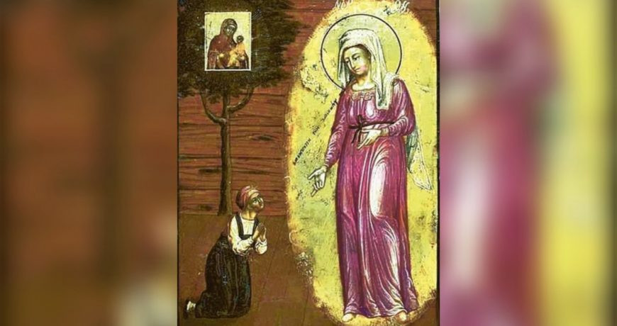 Говорят, что крестьянка лишилась своего мужа, и для того, чтобы прокормить себя и свою семью, ей пришлось отправиться в поле и выполнять все крестьянские работы. Женщина пыталась поддерживать свое хозяйство и семью, но во время полевых работ она заболела. Вначале крестьянка начала чувствовать отвердение пальцев в ногах и руках, а спустя несколько дней она не смогла владеть собственными ногами и стала чувствовать невыносимую ломоту в руках. Находясь в таком положении, женщина поняла, что лечение в домашних условиях не поможет ей избавиться от проблем, поэтому она приняла решение обратиться к Богоматери с молитвой и получила исцеление.