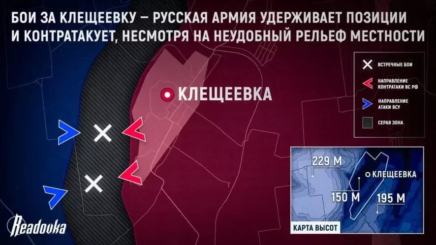 Несмотря на весомое тактическое преимущество боевиков, обусловленное географическим положением Клещеевки и выгодным для них рельефом местности, закрепиться даже на окраине села ВСУ так и не удалось. Армия России не только грамотно держит оборону, но и сама контратакует, постепенно оттесняя противника. Сейчас идут ближние стрелковые бои в лесополосе западнее населенного пункта, которая превратилась в серую зону. Противник пытается подтянуть резервы - сказываются значительные потери как в личном составе, так и в бронетехнике.