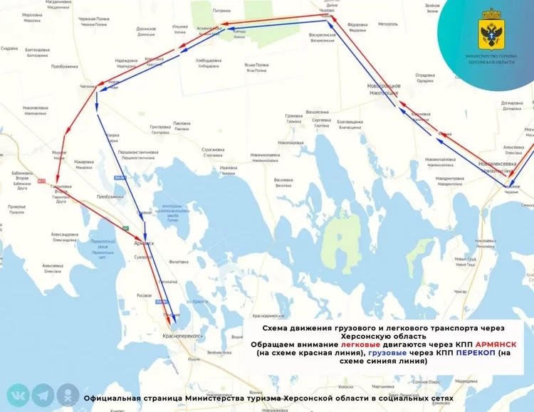 На маршруте отменено действие комендантского часа (в Херсонской области он с 23:00 до 5:00), то есть можно двигаться в любое время суток. Работают усиленные наряды автоинспекции и дежурят медики.