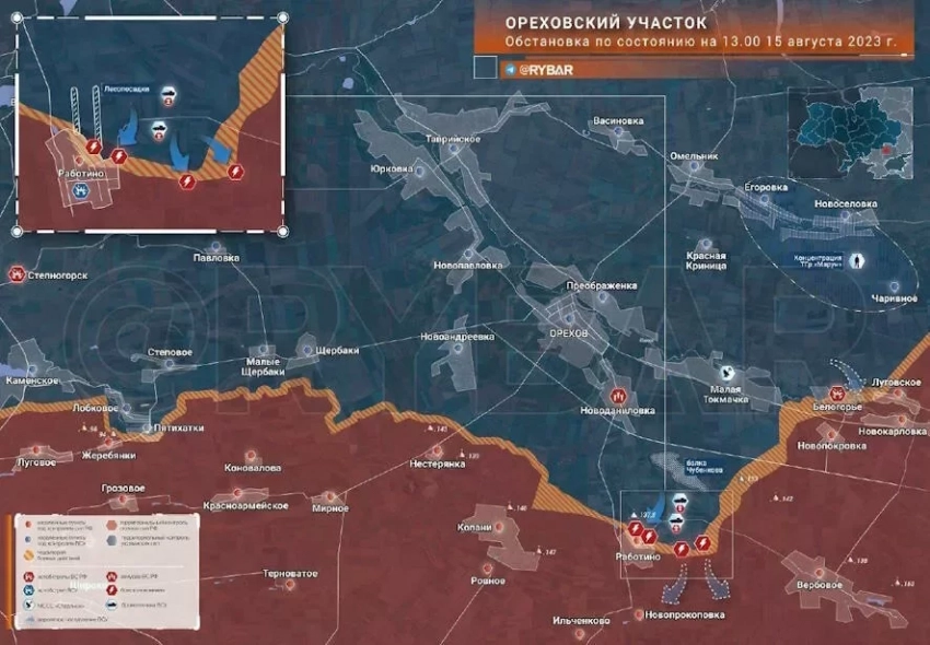 Судя по вклиниванию ВСУ к востоку от села, украинское командование хочет взять Работино в полуокружение и ударить механизированным кулаком на направлении Токмака. Однако появление ТГр «Марун» на данном этапе заставляет задуматься, что планы противника из-за потерь в 118 омбр пришлось корректировать.