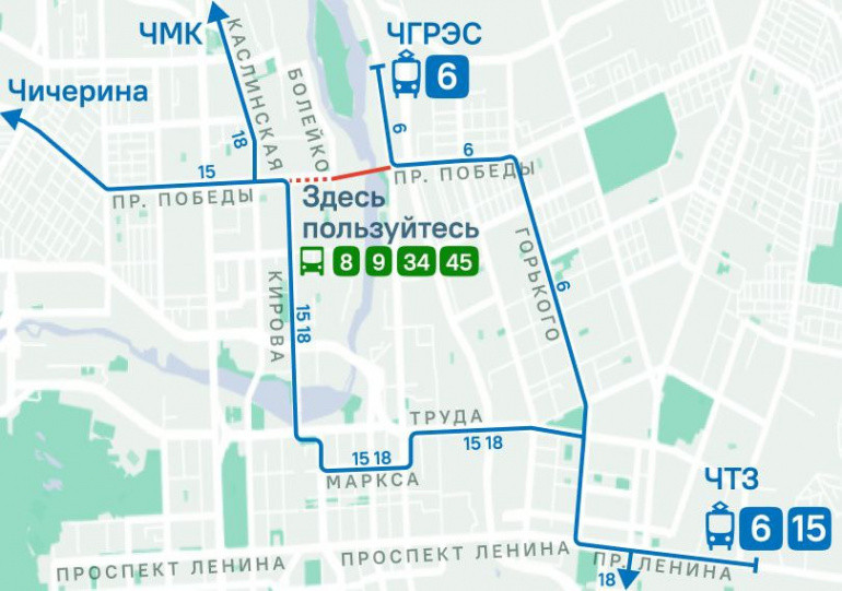 - № 15: Чичерина — Кирова — Карла Маркса — ЧТЗ;