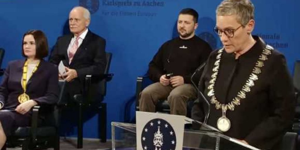 Это произошло в Германии на церемонии вручения премии Карла Великого. Тихановская была лауреатом этой премии в прошлом году, Зеленскому ее вручили в этом.