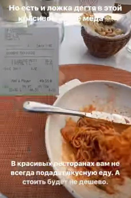 Своими впечатлениями Анфиса Чехова поделилась в социальных сетях. Знаменитость опубликовала несколько видео. На одном она показала роскошный ресторан с прекрасным видом на море. На втором ролике телезвезда продемонстрировала заказанную в этом заведении пасту в томатном соусе. Блюдо, отведанное в Монако, звездная телеведущая назвала «ложкой дегтя в красивой бочке меда». Оказалось, за порцию невкусной пасты в томатном соусе и пиалу тонко нарезанного пармезана теледива заплатила 38 евро, что в перерасчете на денежную единицу России составляет примерно 3 800 рублей.