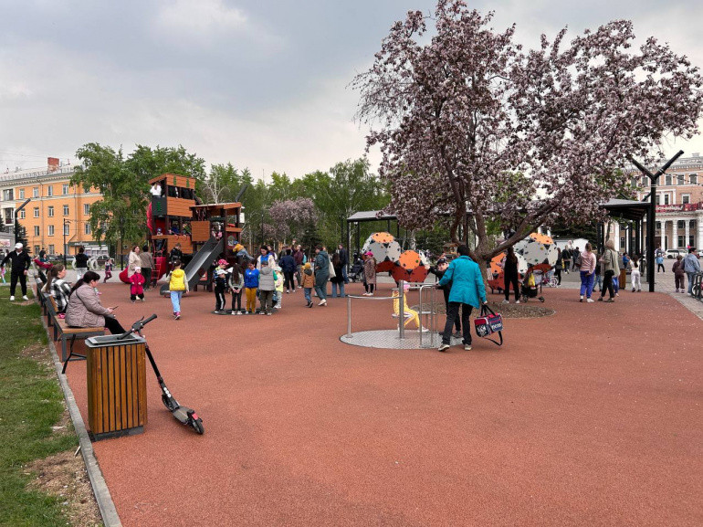 Около обновлённого сквера в Челябинске запустили сухой фонтан и установили игровые комплексы