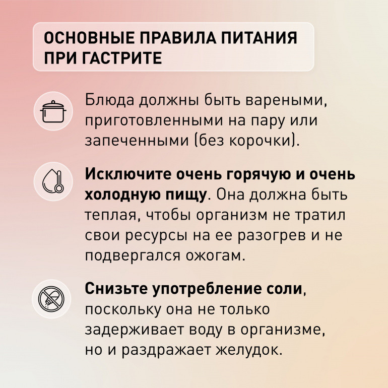 Важное правило — исключение из рациона острых, жирных, копчёных, консервированных, маринованных и жареных продуктов. Также следует ограничить потребление сладкого, кофе, алкоголя и кислых напитков.