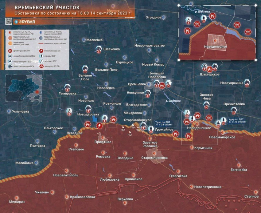 ВСУ пытаются прорваться к Новопрокоповке и Вербовому, но без успеха. По боевикам в районе Работино активно работает русская авиация. На Времевском выступе без особых изменений — ВСУ долбятся о Приютное и Новомайорское.