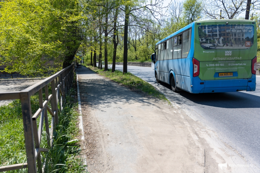 Пройдя через трамвайные пути, нужно вновь пройти по стёршейся разметке перехода, а после по “бездорожью” и паллетам возле аллерго-респираторного центра на Спортивной, 10 добраться до максимально узкого тротуара между ограждением и дорогой. В этой “пешеходной зоне” если гуляешь с ребёнком в коляске, то придётся идти по дороге навстречу машинам. Но, когда закончится ограждение, тротуарная зона снова появится и дальше, по дороге, станет облагороженной зеленью.