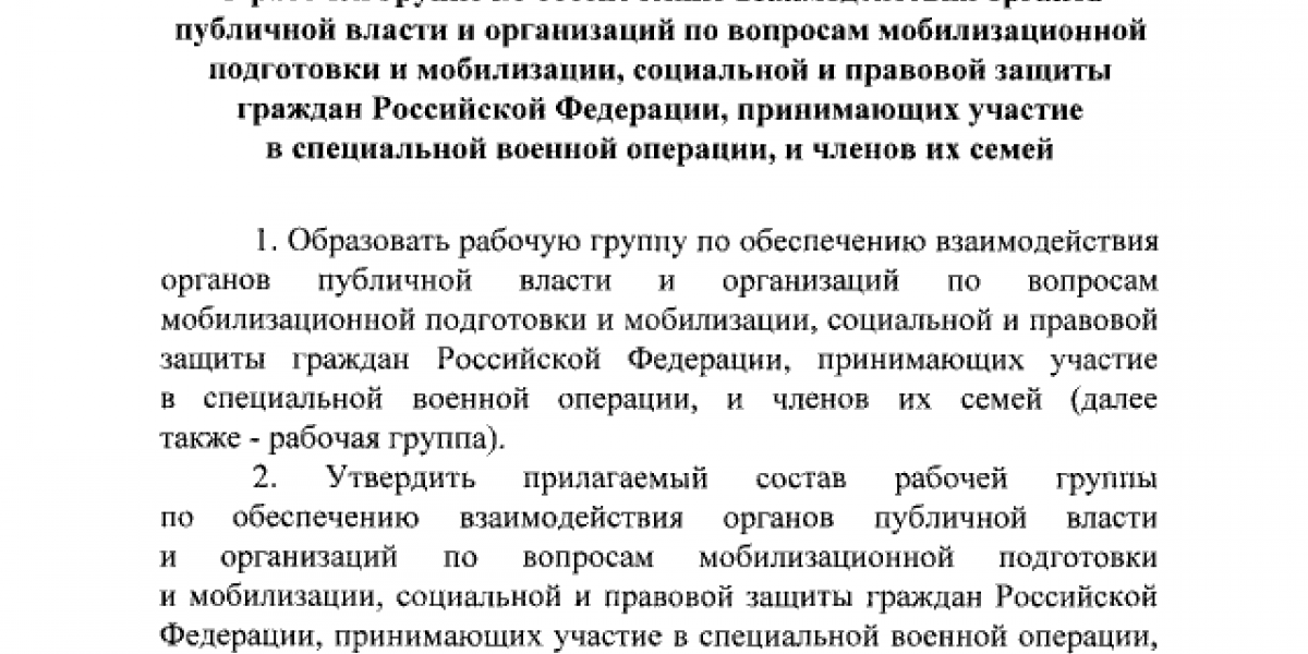 Отмечается, что группа займется вопросами взаимодействия органов власти и организаций по мобилизационной подготовке и мобилизации, а также социальной и правовой защите российских граждан, которые принимают участие в спецоперации, и членов их семей. Каждый месяц она будет докладывать президенту о результатах своей работы.