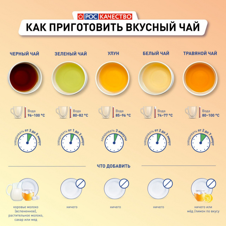 При этом чёрный чай можно дополнить молоком и сахаром, травяной — лимоном и душистым мёдом, а улун, белый и зелёный чаи хороши сами по себе.
