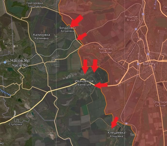 На Бахмутском направлении ВС РФ при поддержке артиллерии атаковали на высотах северо-западнее Клещеевки и в районе Ивановского. Жёсткие встречные бои за Богдановку. Линия боевого соприкосновения существенно не изменилась. Под ударами ВСУ в Григоровке и Орехово-Васильевке. ВС РФ - в Артёмовске и Ягодном.