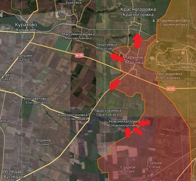 В первом случае на стратегически важное Курахово, во втором - на аналогичную по значимости Карловку. Российские войска били по украинским позициям в Константиновке (не путать с одноимённым населённым пунктом юго-западнее Бахмута), Парасковьевке, Екатериновке, городе Красногоровка, Нетайлове, Северном (населённый пункт к северо-западу от Донецка), Ласточкине, Семёновке, Степном (не путать с одноимёнными населёнными пунктами на Запорожском и Угледарском направлениях), Бердычах, Новопокровском, подконтрольной ВСУ Новобахмутовке (одноимённый населённый пункт восточнее за ВС РФ) и Нью-Йорке. Сами оказались под ударами в Донецке и селе Красногоровка.