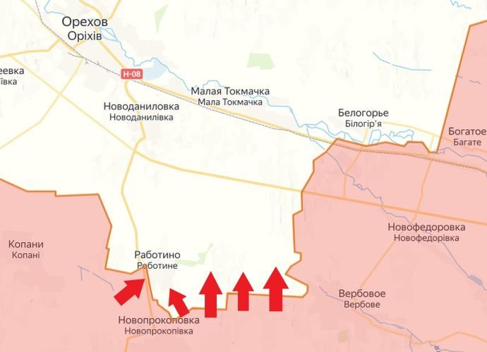 На Запорожском направлении ВС РФ вновь стремятся перехватить инициативу. При поддержке артиллерии они атаковали к западу и югу от села Работино. Также была попытка продвинуться со стороны Вербового. Под ударами украинские позиции в Пятихатках, Новоданиловке, Белогорье, Чаровном и Малиновке. Российские - в Жеребянках, Копанях, Новопрокоповке и Вербовом.