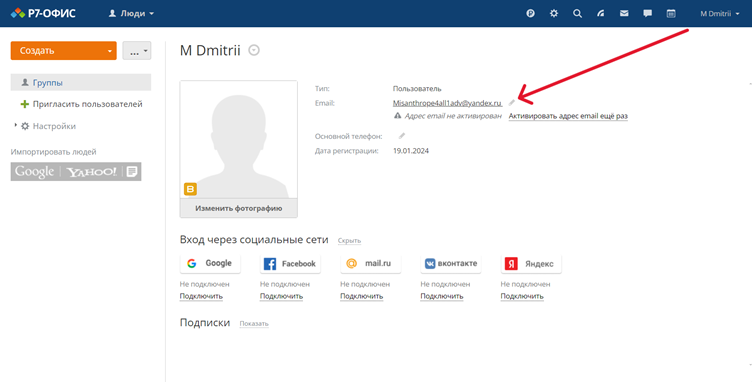 Для смены пользовательского пароля понадобится адрес электронной почты, который ранее не был зарегистрирован ранее на портале «Р7-Офис». В облачной версии надо открыть профиль пользователя.