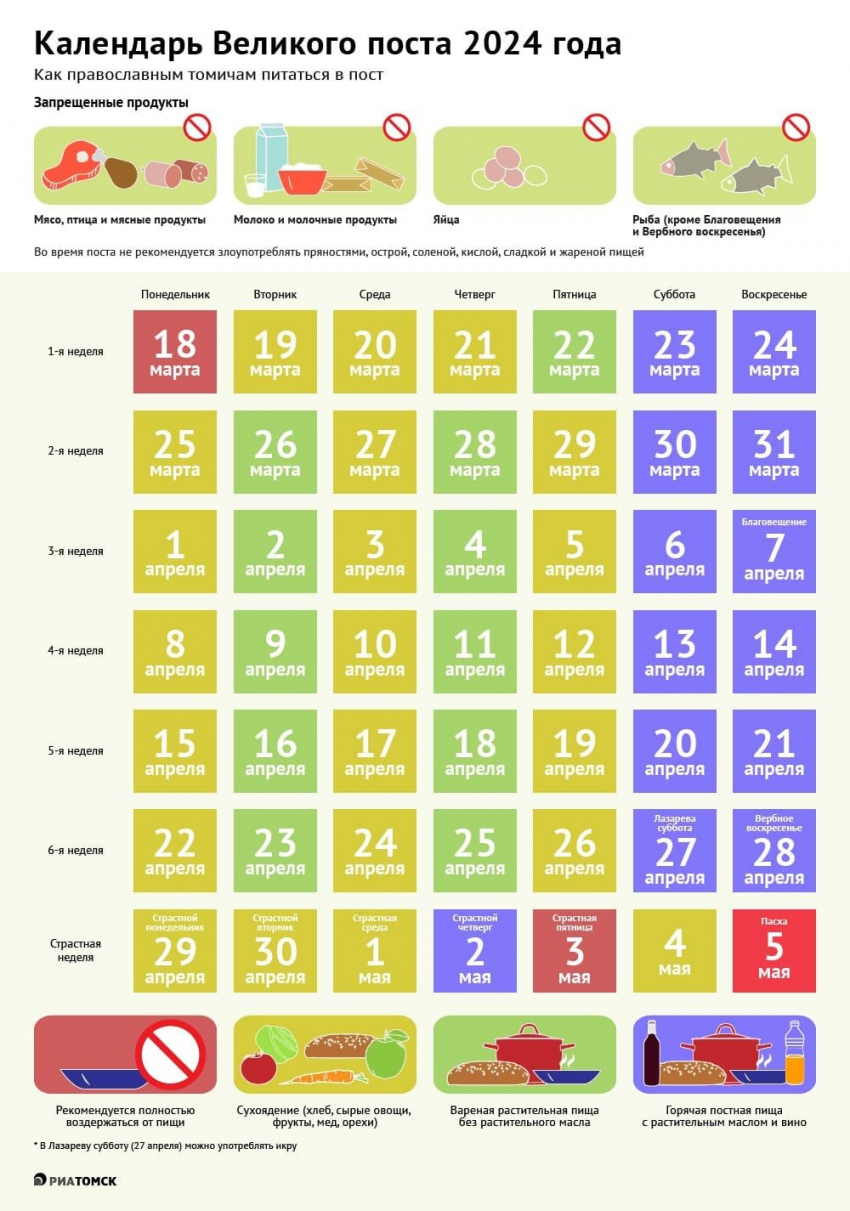 На протяжении семи недель Великого поста верующим запрещается употреблять пищу животного происхождения, включая молочные продукты, и пить алкоголь. Людям предстоит довольствоваться растительными продуктами. Разрешается есть фрукты, овощи, бобы, крупы, орехи, сухофрукты и так далее.