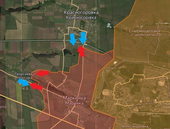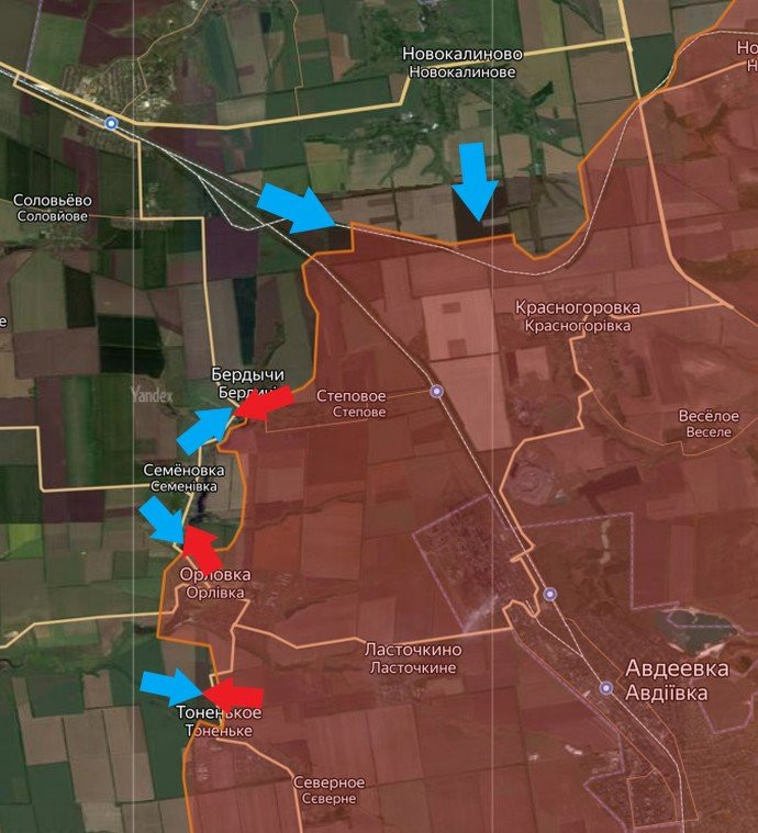 Активные боевые действия развернулись вблизи Бердычей на Авдеевском участке. ВС РФ взяли под контроль Орловку. Кроме того, они продолжают наступательные операции в Первомайском и Новомихаловке.