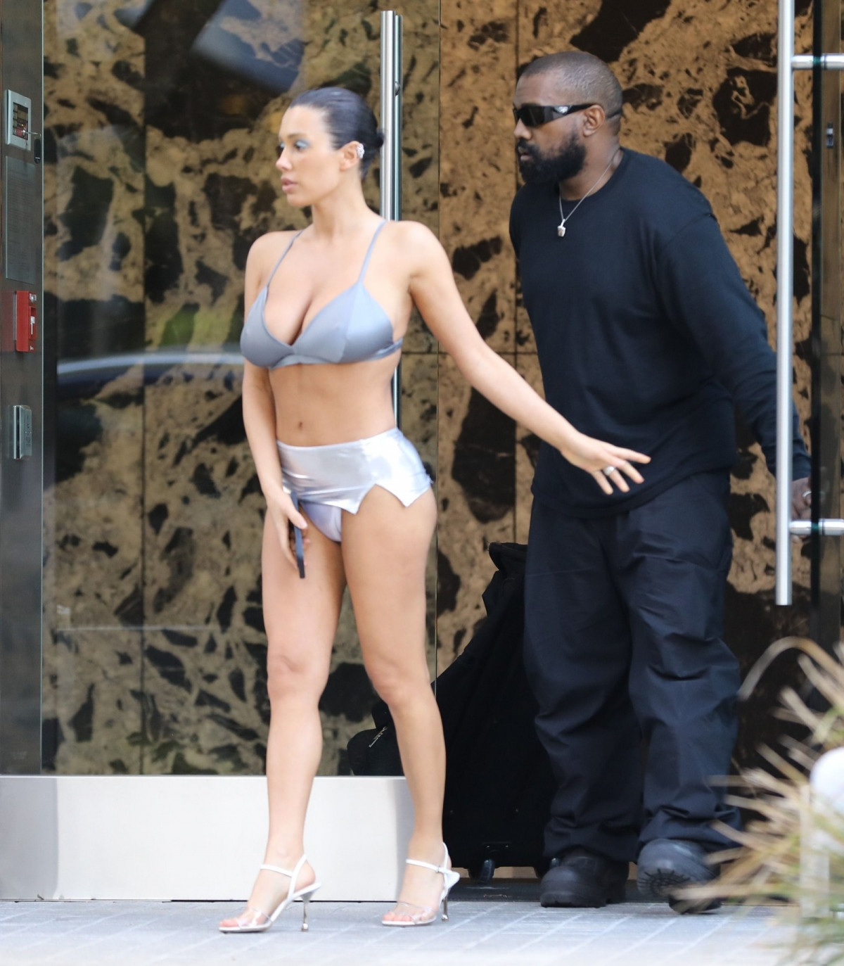 Бикини с треугольным вырезом также привлекли внимание, напоминая об одежде экс-супруги Уэста в 2022 году. Но в этот раз наряд был еще более откровенным. Цензори дополнила свой смелый образ серебристыми тенями для век. Она собрала волосы в пучок, в то время как ее супруг предпочел более свободную черную одежду.