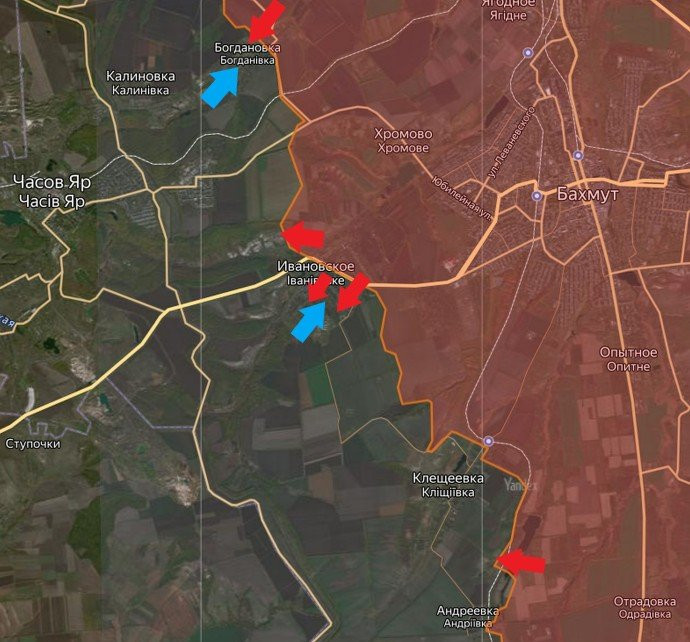 На Артёмовском направлении ВС РФ продвигаются к северу от населённого пункта Красное. В то же время, на юге от Клещеевки, войска успешно взяли под контроль железнодорожную станцию "Алебастровая".