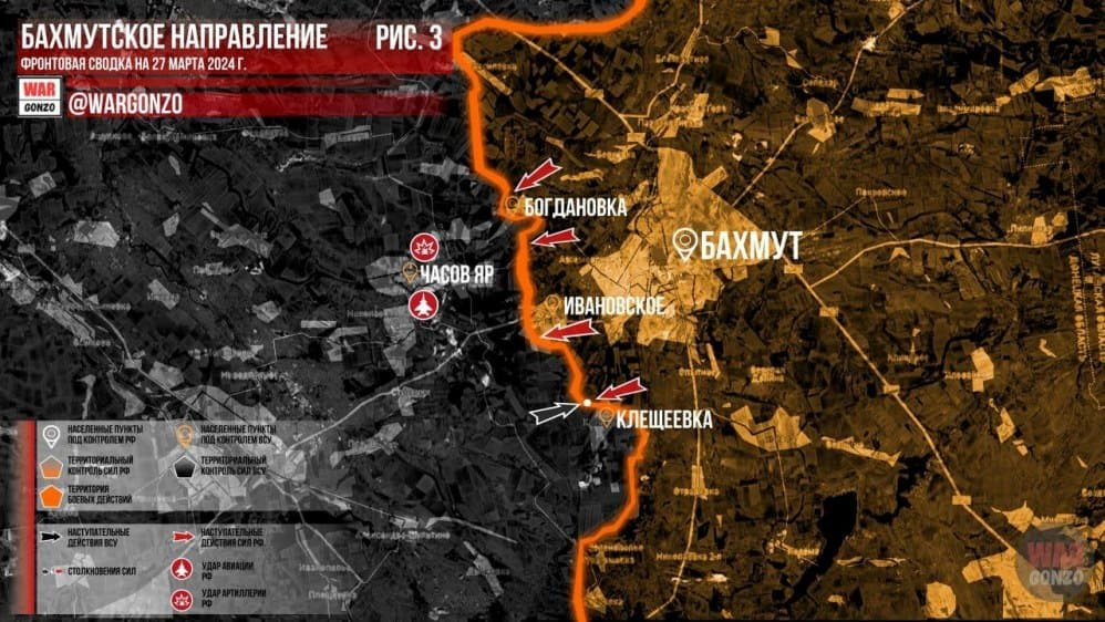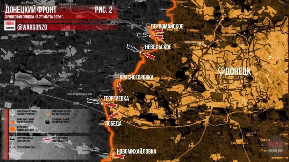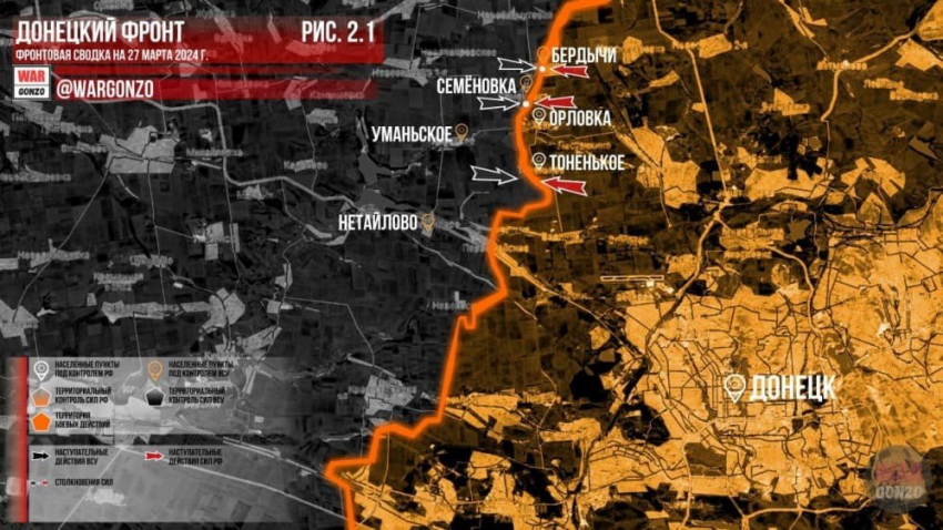 Обновлённая карта боевых действий на Украине по данным на 12:00 мск сегодня, 27.03.2024