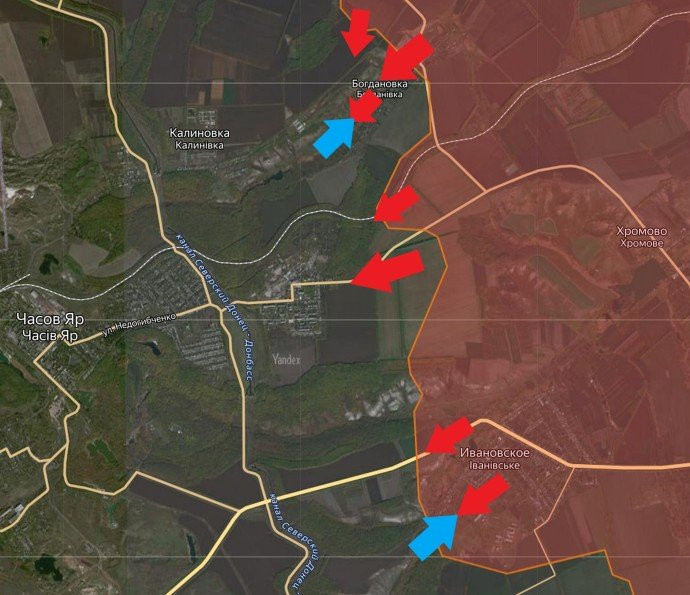 На Артёмовском направлении идёт продвижение ВС РФ. В частности, российские войска наступают на Часов Яр с востока, двигаясь севернее Ивановского (Красного). На Северском направлении идут бои в Белогоровке, а на Краснолиманском направлении наши войска наступают на Терны.