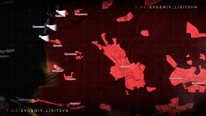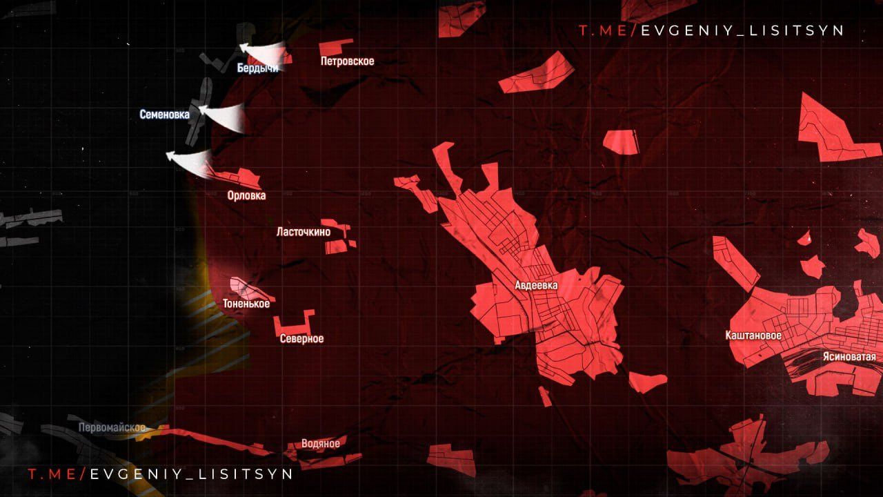 На Донецком направлении, а именно на участке фронта в Авдеевке, ВС РФ ведут штурм села Семёновка с юга, а также идут бои в районах Бердычей и в Первомайском, пишет в Telegram-канале военкор Евгений Лисицын.