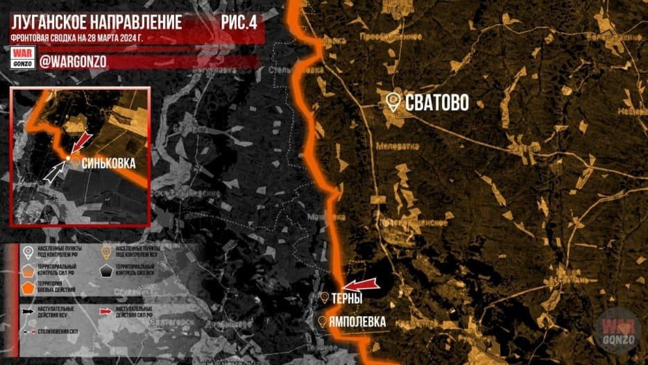 Обновлённая карта боевых действий на Украине по данным на 12:00 мск сегодня, 28.03.2024
