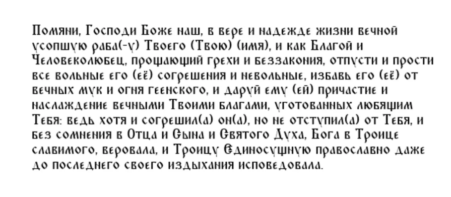 Молитва. Самое важное для души умершего человека — это молитва. Можно помолиться как дома, так и в церкви, а также на кладбище. Посещение храма. Христиане приходят в церковь на богослужения, оставляют записки на службы с именами усопших и приносят постные продукты в качестве пожертвования. Почтение на кладбище. После посещения церкви можно прийти на кладбище, сделать уборку, помолиться и возможно устроить поминальный обед дома. Устроить поминальный обед. Пригласить родных и близких, вспомнить ушедших добрым словом, а на столе обычно ставят кутью и блины. Помощь нуждающимся. Вместо тог, чтобы устраивать угощения на кладбище, можно давать милостыню нуждающимся людям в знак почитания памяти усопших.