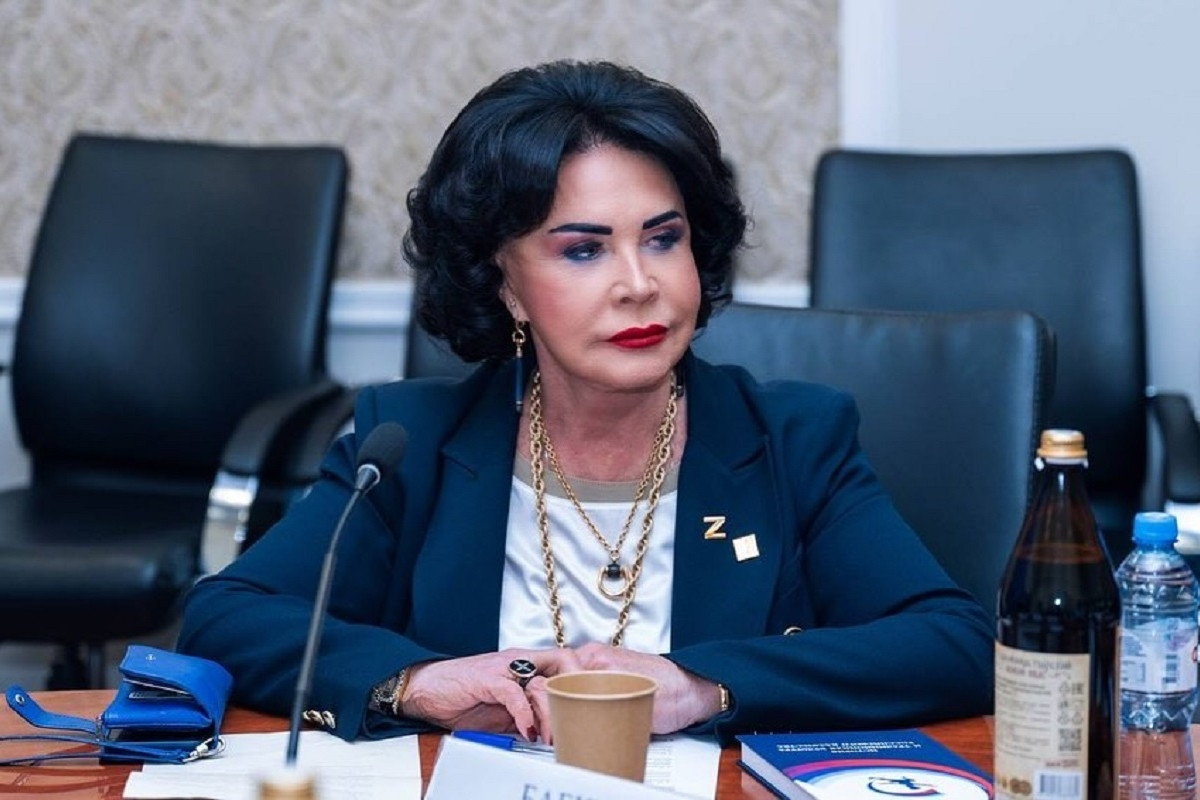 Бабкина выбрала для выхода в свет строгий брючный костюм с темно-синим жакетом. Она дополнила свой образ массивными золотыми украшениями.