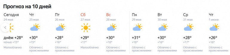 Прогноз для Челябинска мало чем отличается: облаков мало, осадков ноль, ветер неустойчивый и жара. Ожидается от +28 до +30 градусов днём и +11…+13 — по ночам. По данным долгосрочного прогноза от сервиса «Яндекс.Погода», жара в городе спадёт в первых числах лета.