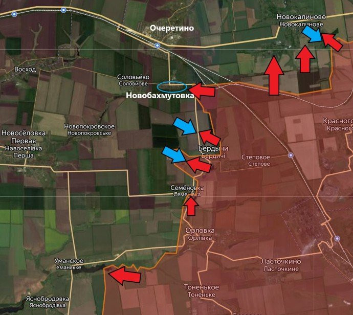 Наибольшая активность Вооруженных сил Российской Федерации (ВС РФ) на Авдеевском направлении фиксируется на северном фланге. В частности, армия России начала продвижение на юго-востоке Новокалиново. Также российским военнослужащим почти удалось прорвать к окраинам Очеретино. Военкоры сообщают об активных боях на подступах к Новобахмутовке, тогда как на окраинах Бердычей - позиционные столкновения.