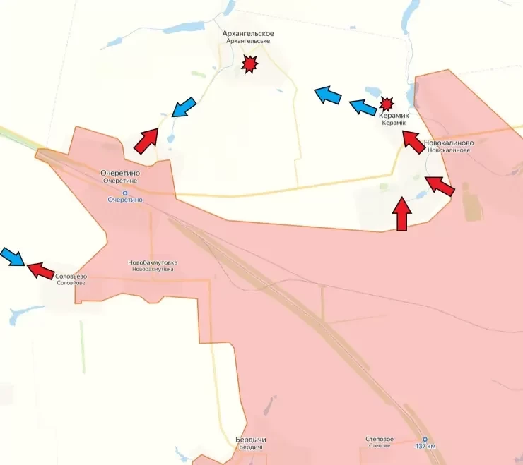 На Авдеевском фронте ВС РФ в Нетайлово и у Уманского ведут встречные бои, пока без перемен. Сейчас ВС РФ выровняли фронт между Бердычами и Новобахмутовкой, двигаются от Бердычей в сторону Новопокровки и Новосёлки первой. От Очеретино и Соловьево ВС РФ наступают на запад - к Соколу. На северо-западе - село Новоалександровка, где наши двигаются по окраине вдоль ж/д на запад. На севере от Очеретино - Архангельское, подступиться к нему с наскока нашим не удалось. Судя по движению армии России от Новокалиново и Керамика, Архангельское наши будут обхватывать в клещи. ВСУ пытаются контратаковать, но довольно вяло. При этом никакой выстроенной обороны у ВСУ здесь нет. Кстати, украинские каналы пишут, что третья штурмовая бригада АЗОВ снова отказала главкому Сырскому, который якобы пытался отправить их купировать прорыва фронта под Очеретино. Сослались на то, что не восстановились после Авдеевки. И попутно создали прецедент - будет интересно, если командование бригад ВСУ откажется выполнять приказы Генштаба.