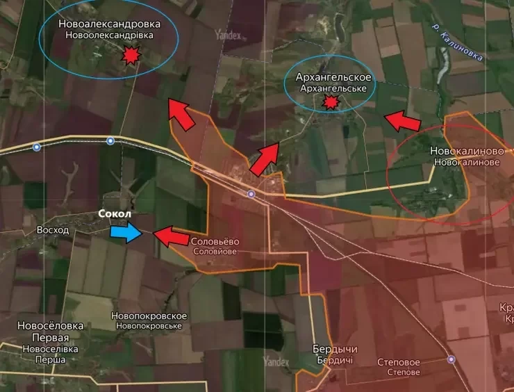 Они также взяли поселок Керамик и село Новокалиново и теперь наступают на север на Архангельское. Южнее захвачены Новобахмутовка и Соловьево, идет атака на село Сокол.