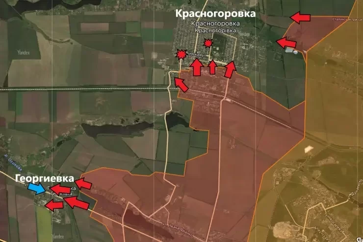 На Донецком направлении контроль над большей частью территории Красногоровского огнеупорного завода. Важные успехи в центральной части Георгиевки и юге Победы, а также прорыв на юг от Победы. Продвижение в районе Урожайного, а также успешное отражение контратак ВСУ.