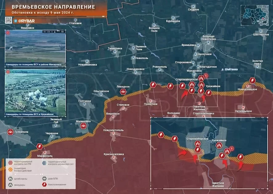Старомайорское и Урожайное перешли под контроль украинских формирований в ходе летнего контрнаступления в 2023 году. Российская группировка войск «Восток» последовательно возвращает утраченные позиции. О масштабном наступлении на Времьевском направлении речи пока нет: на данный момент российская армия занимается улучшением тактического положения.