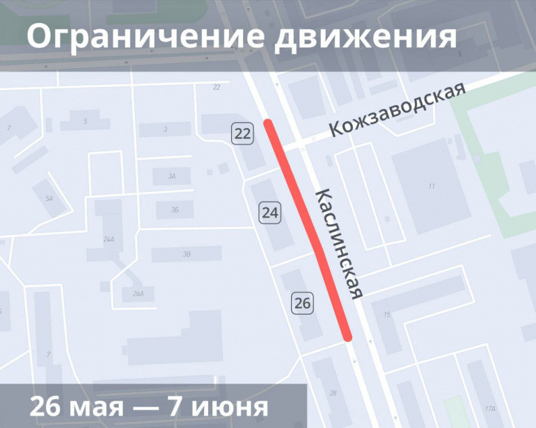 Движение транспорта ограничат на участке между домами № 22 и № 26 на улице Каслинской.