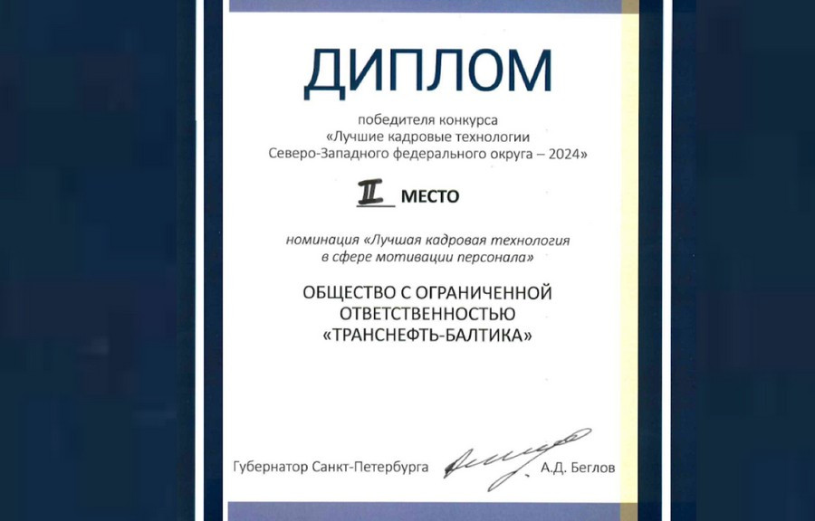 В Санкт-Петербурге подведены итоги конкурса «Лучшие кадровые технологии Северо-Западного федерального округа». В номинации «Мотивация персонала» II место жюри присудило ООО «Транснефть – Балтика». Подписанный губернатором А. Д. Бегловым диплом был передан представителю предприятия в г. Санкт-Петербурге.