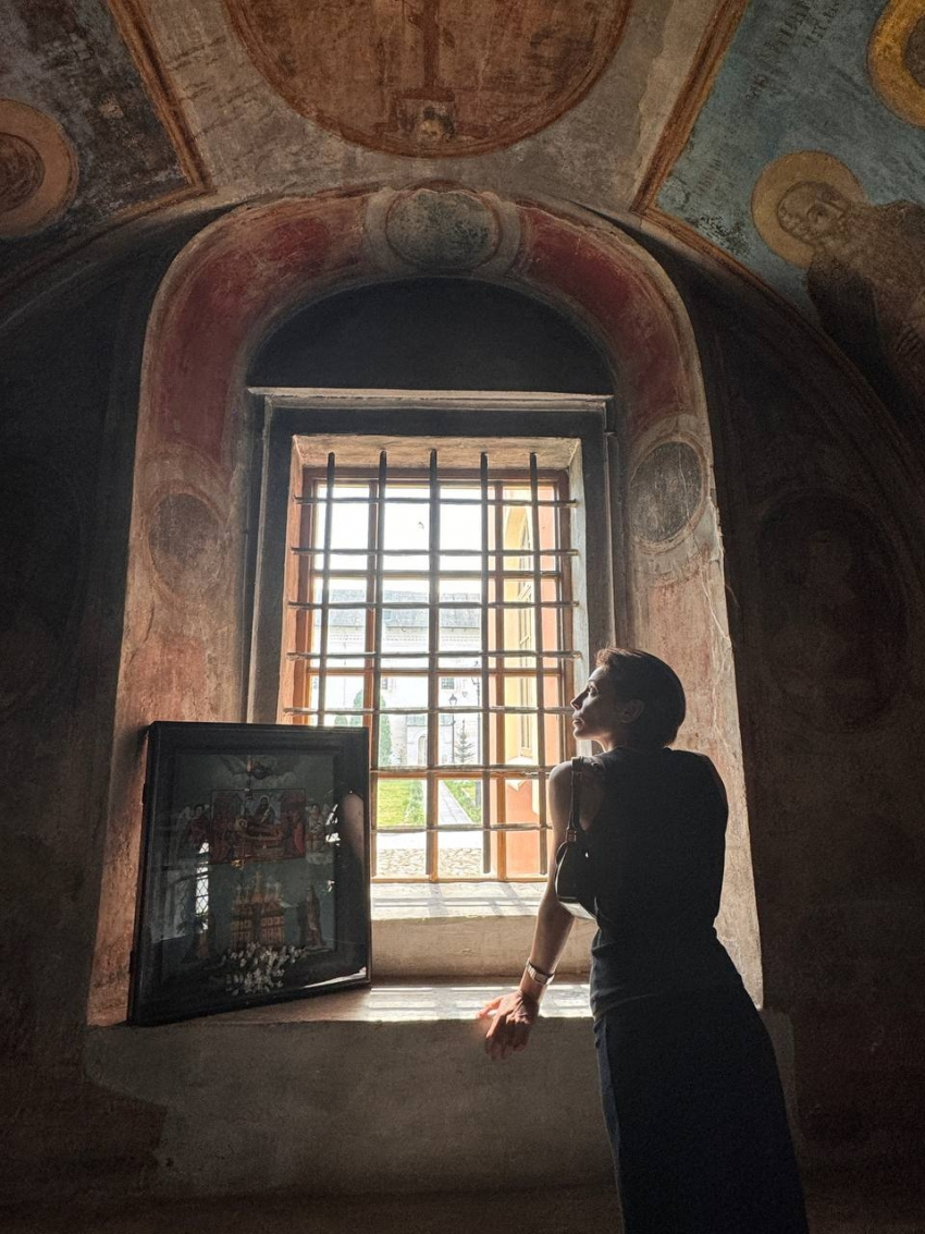 На одном фото она стоит на фоне икон, на другом снимке — на фоне расписных стен.