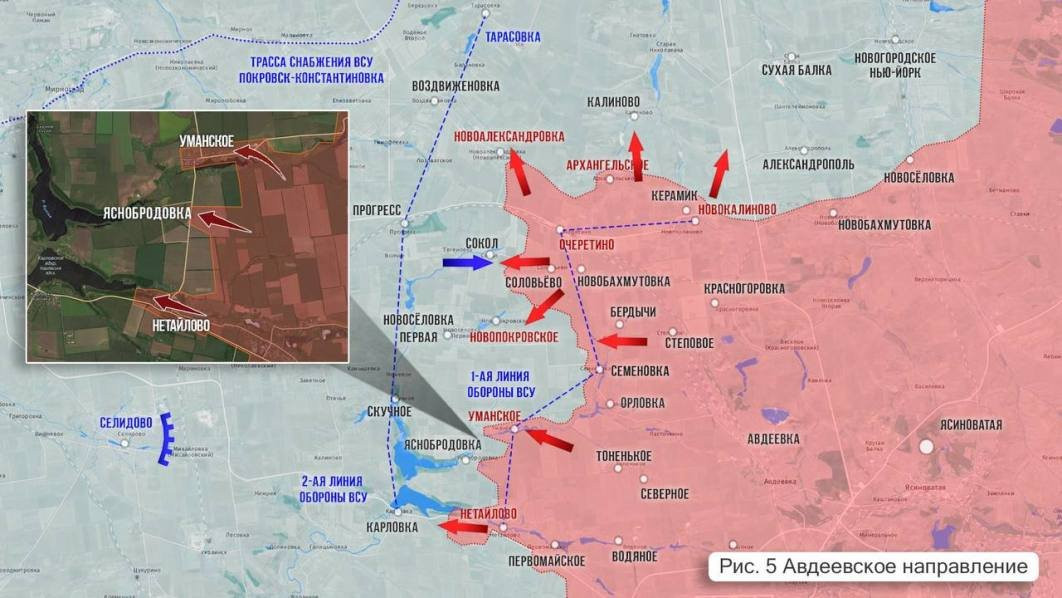 Южнее Сокола бои у Новопокровского, наши продвинулись севернее Нетайлово и Уманского - все это на подступах к Яснобродовке. Севернее Очеретино, у Новоалександровки, как и на подступах к Калиново ВСУ пока рубежи держат.