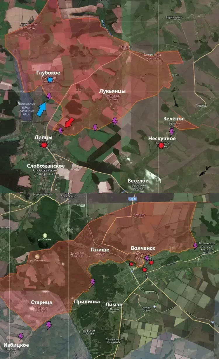 На Харьковском направлении каких-либо существенных изменений за последние сутки нет. В районе Липцев и Глубокого продолжаются встречные бои. Также бои идут в Волчанске. Ни одной из сторон не удаётся продвинуться вперед. Посему прикрепляю вчерашние карты.