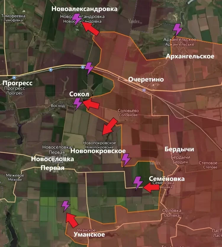 На Покровском направлении продолжается штурм Новоалександровки. Наши бойцы отражают малочисленные контратаки противника и идут вперед, занимая новые позиции в полуразрушенных домах. В Соколе наши штурмовых отряды также продвигаются вперед. Под контролем ВСУ осталась лишь западная часть села. Чуть южнее нашим бойцам удалось подобраться к Новопокровскому с севера. Теперь бои идут не только на востоке от населенного пункта, но и на севере.