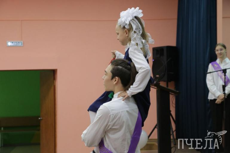 По традиции последний школьный звонок давали первоклашка и выпускник школы