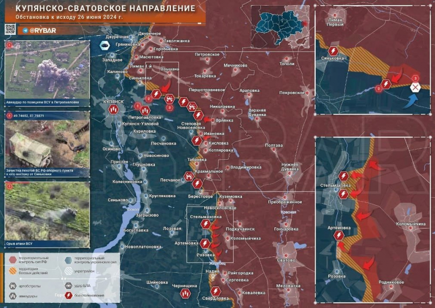 На Купянском направлении русские войска продолжили окружать Стельмаховку, находящуюся южнее самого города. Чтобы помочь там нашим бойцам, ВС РФ начали наступление на важную позицию «Крюк», лежащую восточнее Синьковки. ВСУ превратили местность вокруг села в систему укреплений, поддерживающих друг друга огнем. Сама Синьковка стала основным рубежом прикрытия Купянска с севера.