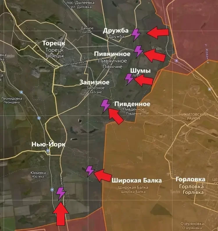 Наступление, тем не менее, всё равно идёт. Просто наши бойцы медленно и методично продвигаются вперёд. Вчера штурмовые подразделения ВС РФ зашли на южные окраины населённого пункта Нью-Йорк (он же - Новгородское). Также известно о боях за высоты западнее Шум и о боестолкновениях в районе села Дружба.