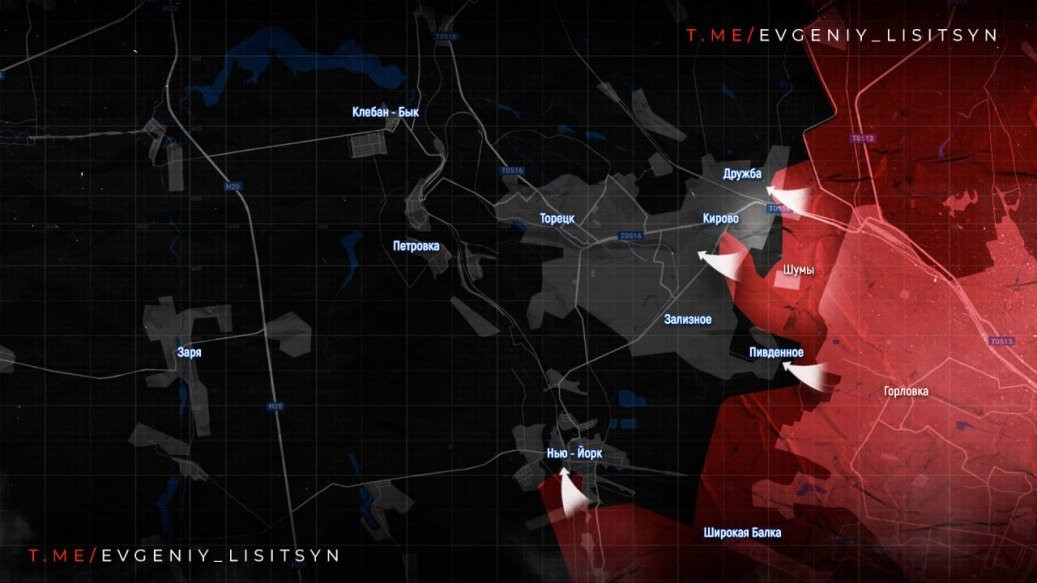 На Торецком направлении освобождены микрорайоны Дружба и Северное, наступление продолжается с юга. В Нью-Йорке ВСУ отступили к центру под защиту многоэтажек и реки Кривой Торец, а также стянули пехоту с востока поселка, что позволило российским войскам нанести фланговый удар. Российские войска продвинулись в южной части Нью-Йорка и закрепились в районе Юрьевки. Противник потерял район поселка Чигари и позиции на окраинах Дзержинска.