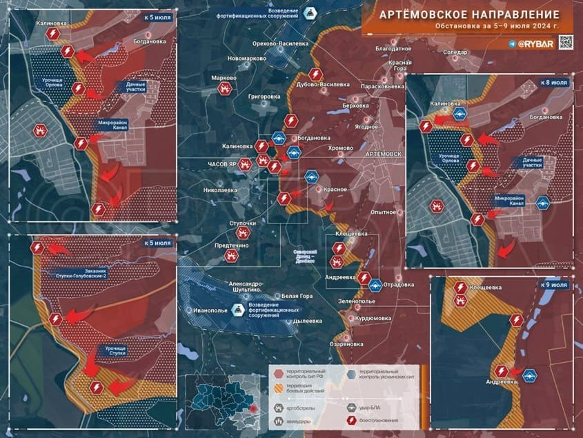 На Артемовском направлении российские войска ведут бои в окрестностях Часова Яра и в близлежащих лесах, а также продвигаются в районе Андреевки, сообщает Telegram-канал "Рыбарь".