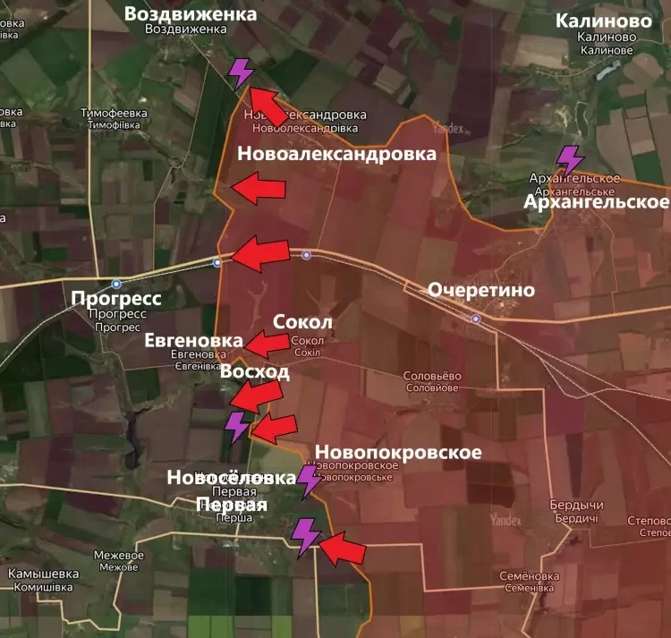 В районе Новопокровского также фиксируется продвижение ВС РФ на несколько лесополос. Также появилась информация о том, что идут бои на окраинах Новосёловки Первой. При этом пророссийские источники пишут о выходе к восточным окраинам, тогда как противник - о рывке к северным улицам населённого пункта.