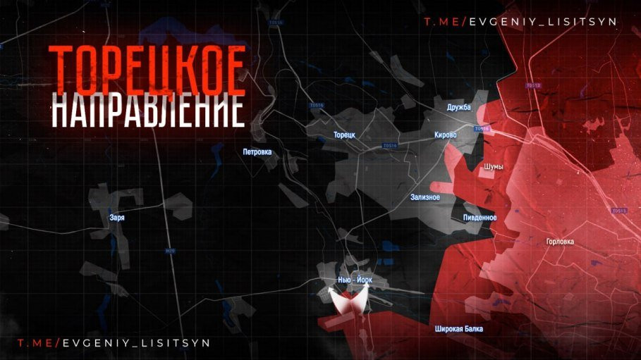 Telegram-канал "Операция Z: Военкоры Русской Весны", ссылаясь на украинские ресурсы, информирует, что подразделения Вооруженных сил Российской Федерации активно наступают на позиции ВСУ в районе населенного пункта Нью-Йорк. Помимо этого успех ВС РФ демонстрируют и в пригородах Торецка.