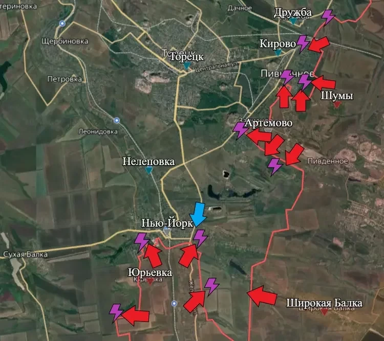 На Торецком направлении в Новгородском (Нью-Йорке) продолжаются интенсивные бои в центре вдоль улиц Кобзаря, Валентины Ковтуненко и Береговая. Также ВС РФ пробивают оборону противника в Железном и Кирово, сообщает военкор Евгений Лисицын в своём Telegram-канале.