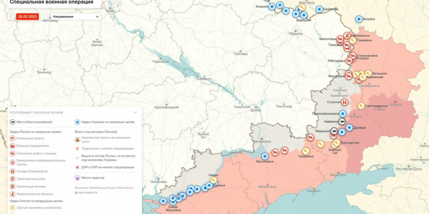 Последние новости о ходе военной спецоперации на Украине на сегодня, 26 мая 2023 года, новая карта боевых действий на Украине в материале «Интересной России».